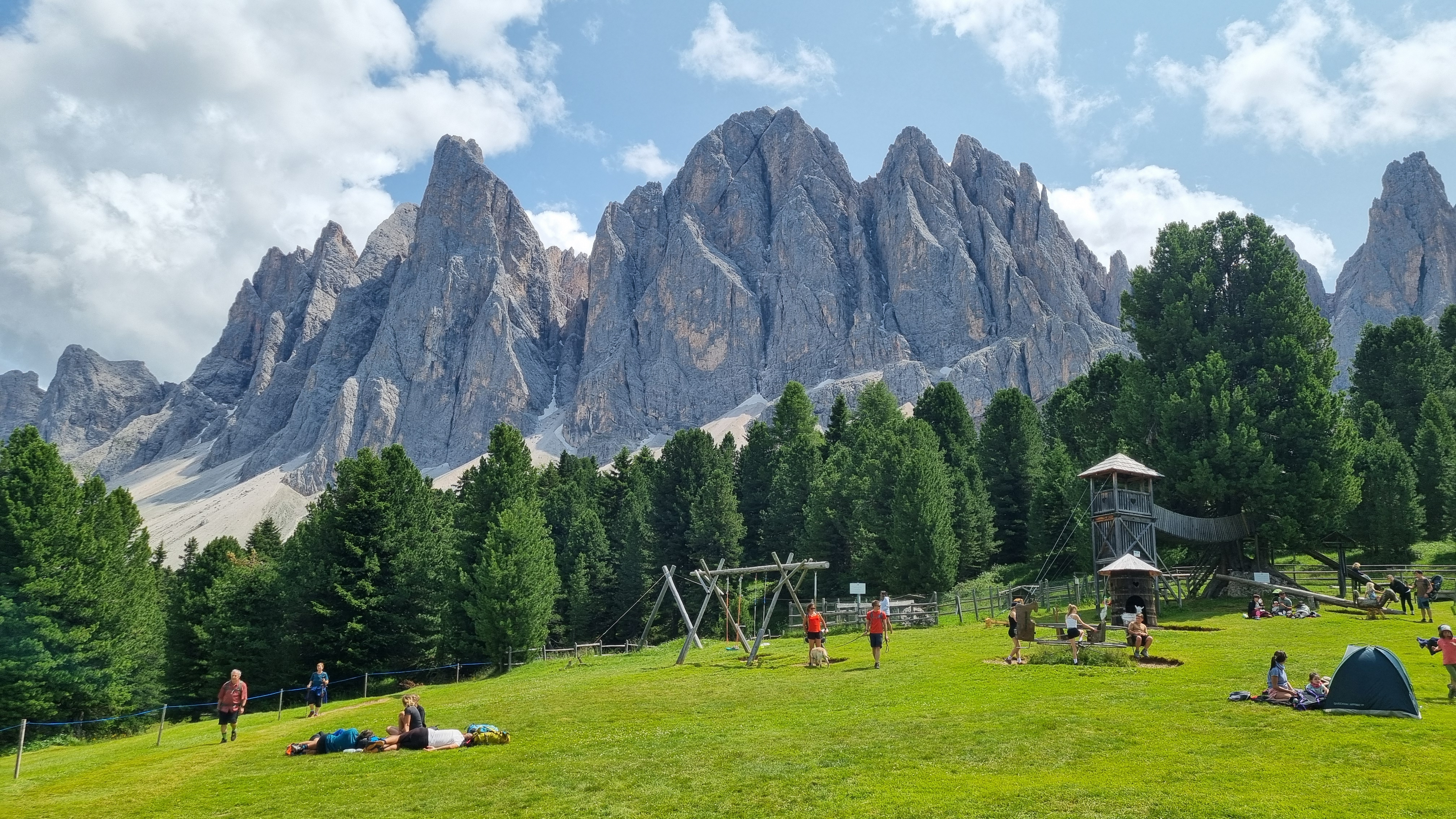 Po brzké snídani výjezd dechberoucím údolím Villnößtal až do letoviska St. Magdalena (východisko prvých túr mladého Messnera) a dále na vysokohorské parkoviště Zanser Alm 1.700m. Výstup na vysokohorskou chatu Broslerhütte 2.040m, dále fantastickou magistrálou Munkelweg pod kouzelnými štíty na chatu Gschnagenhardt Alm 2.000m. Pokračování přes chatu Dusler Alm 1.800m  zpět k autobusu. Možností túr z údolí je samozřejmě mnohem více, např. přes Schlütterhütte 2.300 m na skvělý vyhlídkový vrchol Zendleser Kofel 2422 m apod.