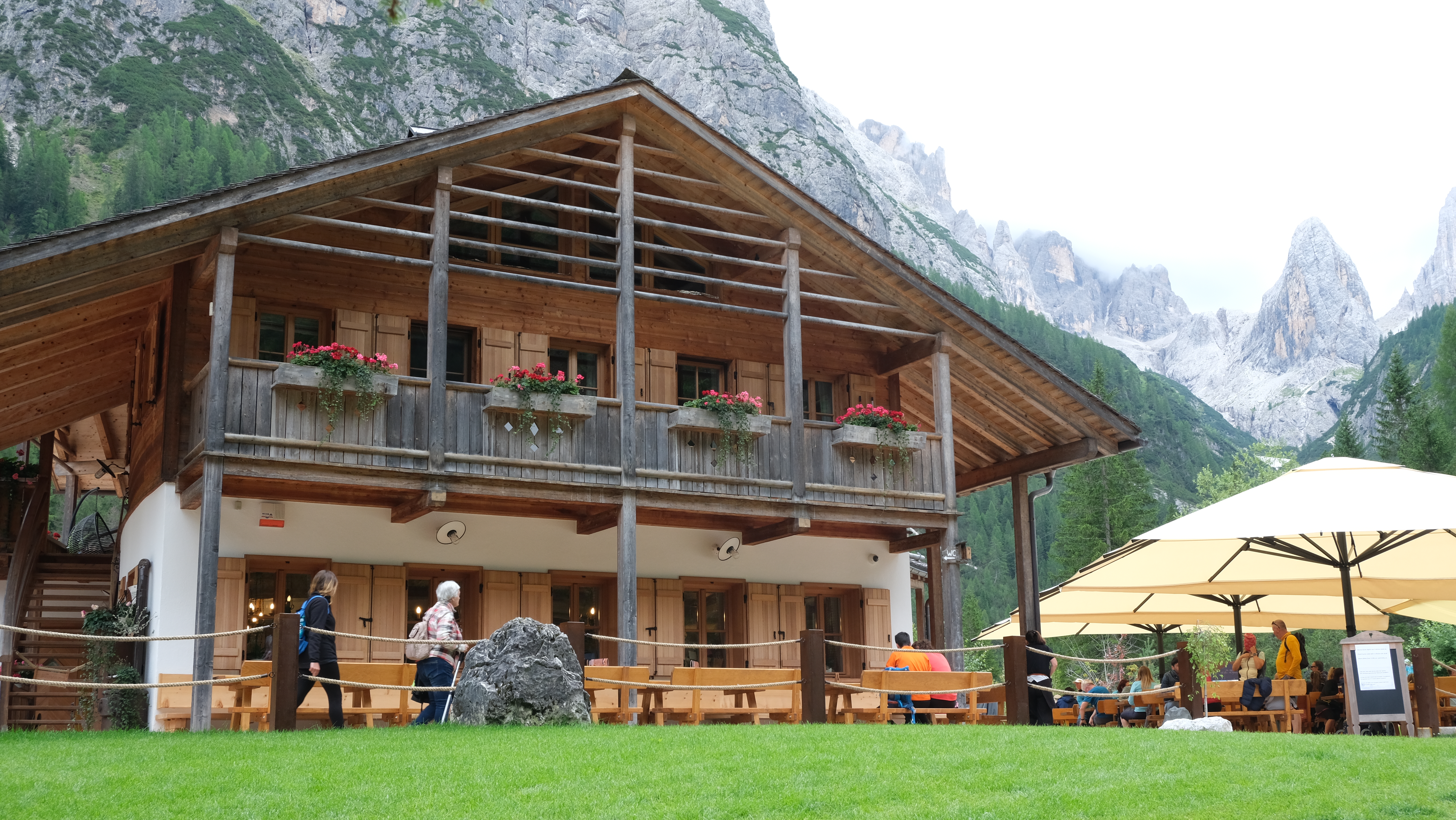 2. den: Ráno příjezd do italského jižního Tyrolska. Krátce po překročení rakousko – italské hranice výjezd přes letovisko Sexten na parkoviště v krásném údolí Fischleintal (ve výšce cca 1.400m) pod severními stěnami asi nejznámějších štítů dolomit – Tre Cime di Laverado (Drei Zinnen). Možnost kratší, jen rekreační túry v údolí (chaty, zřícenina pevnosti, městečko Sexten). Dalším lehčím cílem je menší muzeum války v Dolomitech ležící nad údolím ve výšce 2.100m (dostupné také dlouhou lanovkou). Klasický je však výstup na známou chatu Dreizinnenhütte, ležící ve výšce necelých 2.400m přímo pod monumentálními štíty Tre Cime. Výstup vede divokým údolím kolem překrásných jezer. Z chaty je možno se vrátit, nebo pokračovat na „fotografickou“ chatu Lange Alm pod nejvyšší ze tří věží Laverada. Mimořádně zdatní mohou absolvovat nejkrásnější dolomitskou „trojúhelníkovou“ túru přes chaty Büllelejochhütte  (2.550m), dále populární Rufugio Zsigmondy-Comici 2.220m a zpět do údolí. Tato impozantní celodenní náročná trasa má 21km a překonává převýšení cca 1.400m. Výběr túry závisí na počasí, zájmu účastníků a podmínkách autobusové přepravy. V pozdní odpoledne (dle počasí a podmínek) odjezd na ubytování a večeři do Natzu.
